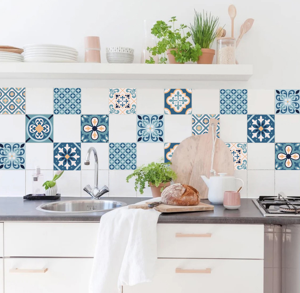 Estrene un ambiente más fresco y vivo en su cocina o cuarto de baño con estos hermosos azulejos en tonos azules, que evocan una soleada playa en el verano mediterráneo. Solo péguelos sobre los azulejos blancos originales y vea cómo se transforma fácil y mágicamente su ambiente.