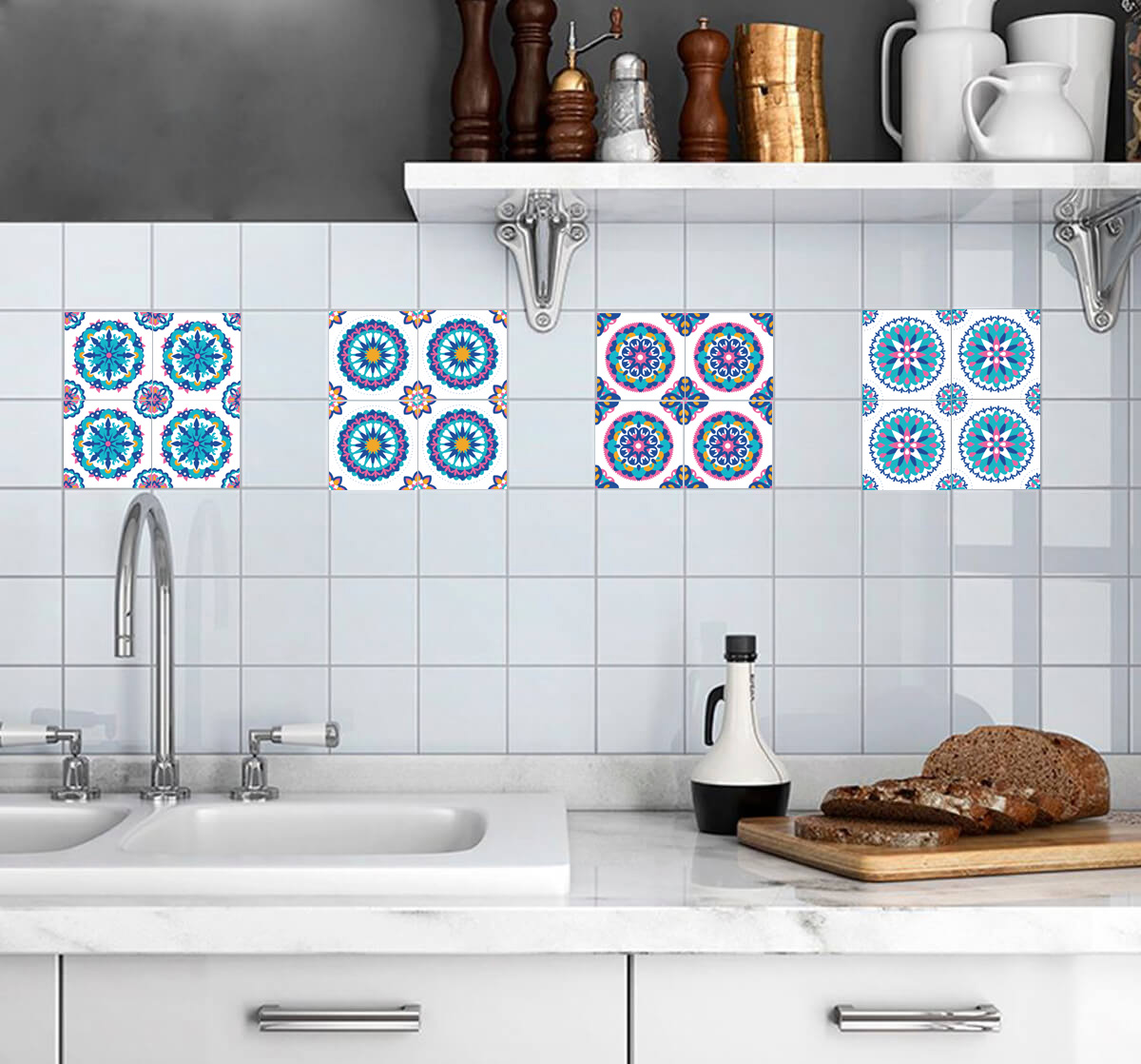 Póngale una refrescante y alegre nota de color tradicional mexicano a las baldosas de su cocina o baño. Solo péguelos sobre los azulejos blancos originales y vea cómo se transforma fácil y mágicamente su ambiente. Puede hacer múltiples combinaciones combinando varios diseños o repitiendo patrones.