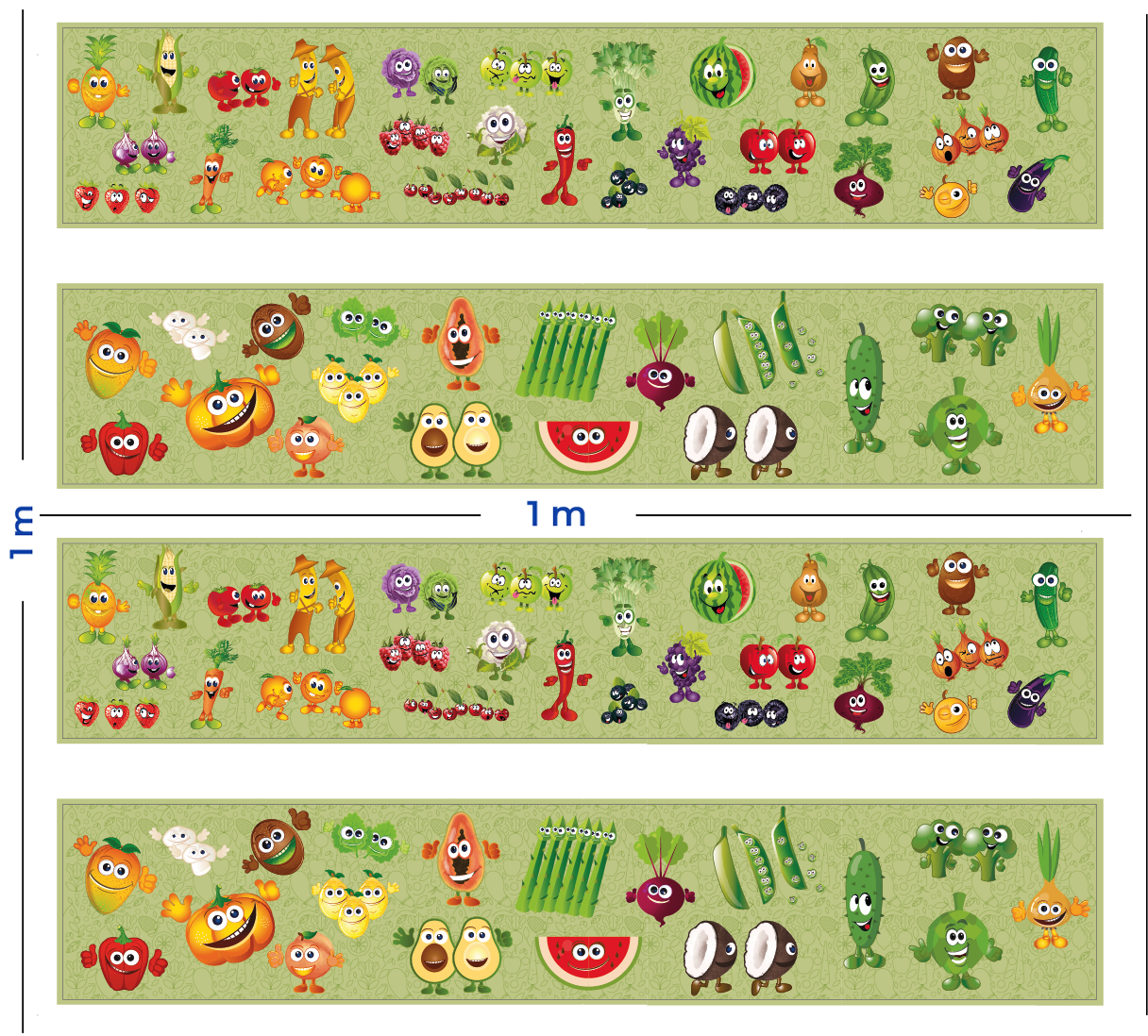 Medidas: Cada tema consta de dos cenefas diferentes, cada una de 90 cm de largo x 17 cm de ancho. En total, se entrega un pliego de 1.00 m x 1,00m con dos juegos, es decir, cuatro cenefas, que cubrirían una longitud de 3,60 m de pared.
