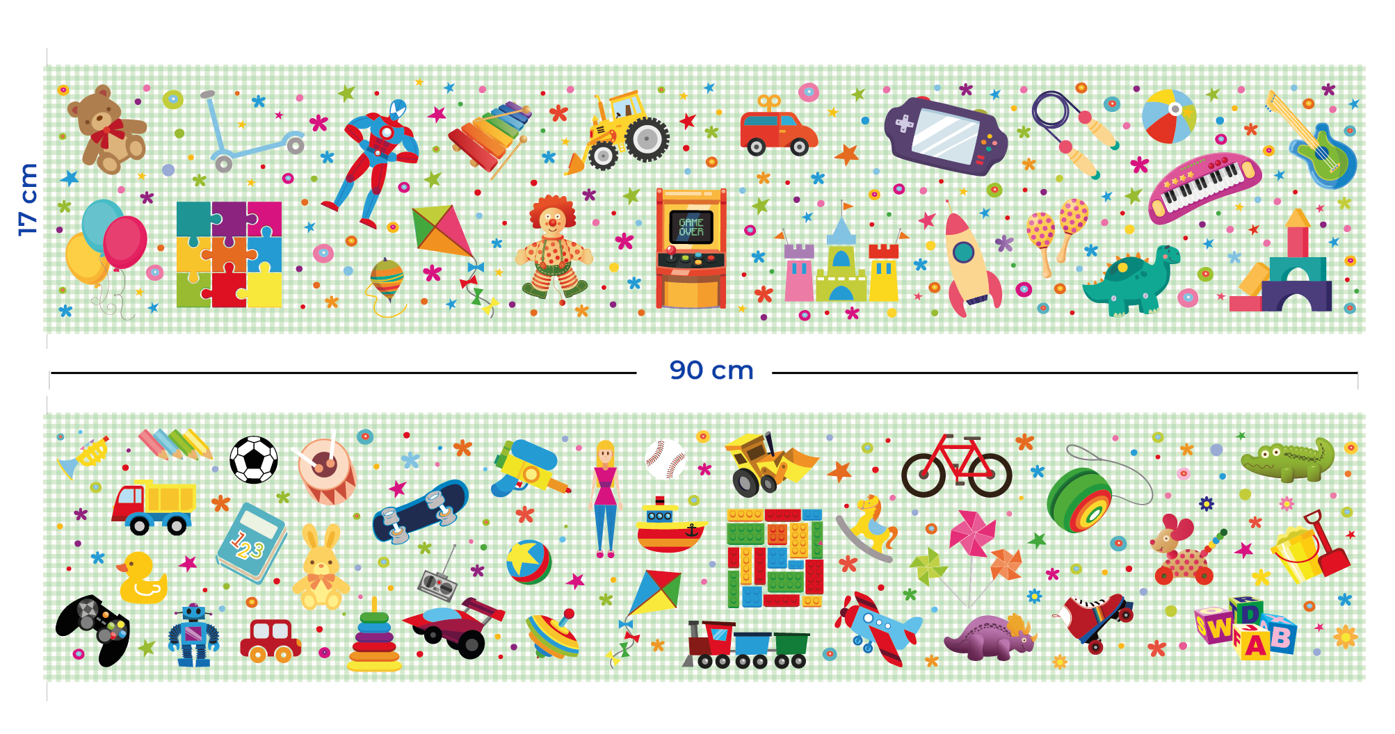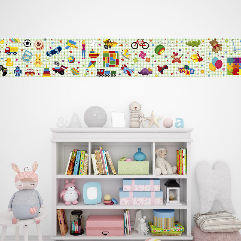La habitación de niñas o niños se transforma en un animado espacio de juegos, con esta alegre cenefa de juguetes variados y multicolores.  Una infancia plena de diversión constante.