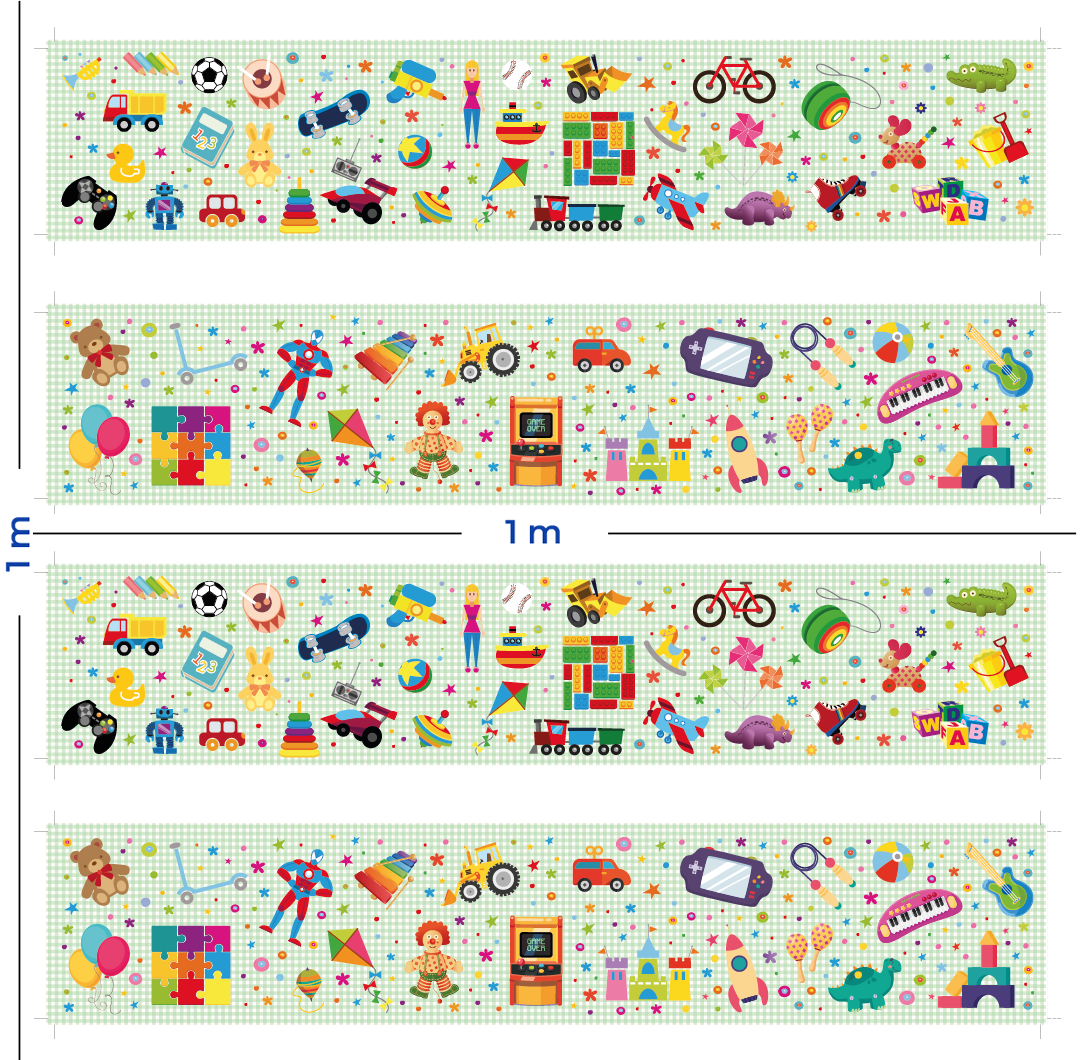 Medidas: Cada tema consta de dos cenefas diferentes, cada una de 90 cm de largo x 17 cm de ancho.  En total, se entrega un pliego de 1.00 m x 1,00m con dos juegos, es decir, cuatro cenefas, que cubrirían una longitud de 3,60 m de pared.