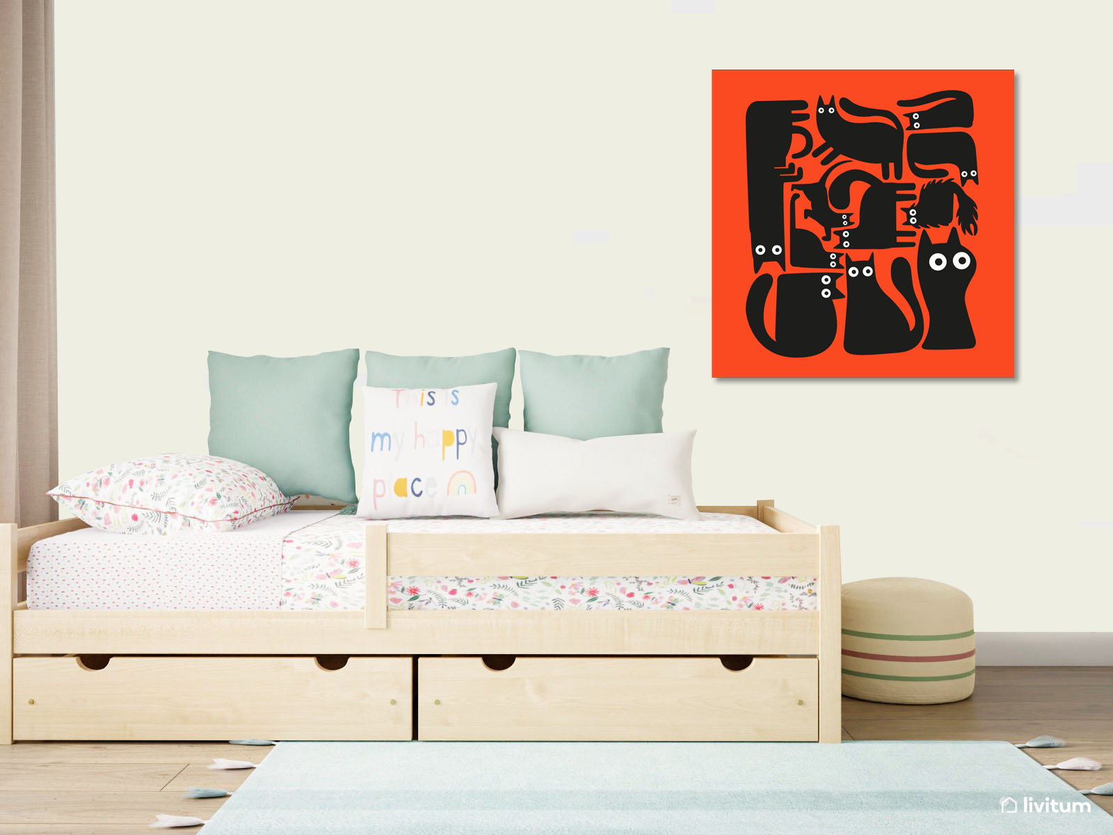 Sobre un cálido fondo anaranjado estos gatos. de simpáticos trazos, le dan darle un toque especial a cualquier habitación. Transforme su espacio con este encantador diseño y disfrute por mucho tiempo de un ambiente único y divertido.
